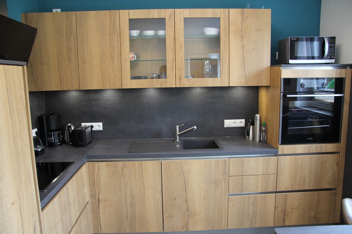 La nostra incantevole casa vacanze a Bell, a soli 2 km dal lago vulcanico Maria Laach, ospita due appartamenti esclusivi. L'appartamento al piano superiore, con camino e grande terrazza solarium, vi offre un elegante soggiorno con cucina a vista e accogliente zona pranzo. Una camera da letto con letto a molle di alta qualità, uno spogliatoio e un bagno moderno garantiscono il massimo comfort abitativo. Perfetto per staccare la spina, fare escursioni, andare in bicicletta o semplicemente godersi la natura dell'Eifel vulcanico.