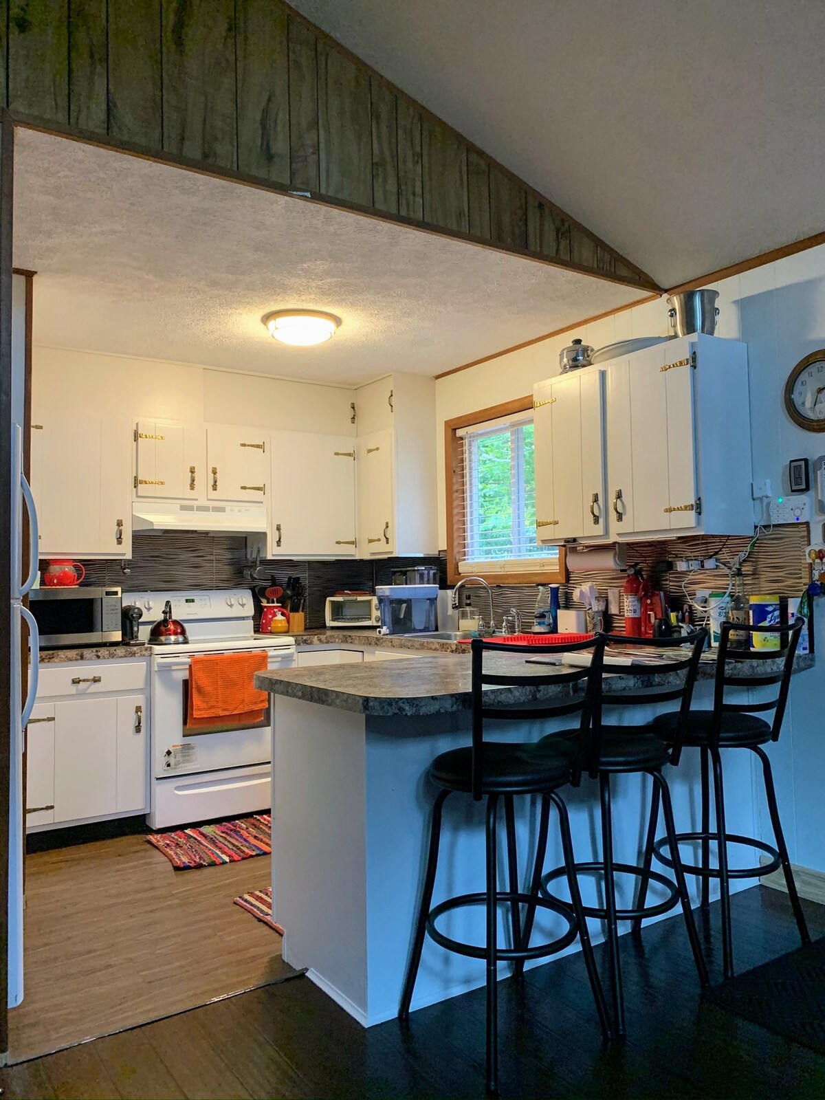 Accommodate 9 people (3 sleep in the living room). Community complete with Pool, playgrounds, basketball and tennis courts. Full Kitchen, all utensils. Vintage bar, open living room with a WOOD BURNING fireplace. Large flat screen smart TV. The living room leads outside to the SECLUDED dining area facing the woods. Outdoor area features gas BBQ grill, fire pit, and hammock. Pets are not allowed. No Air Conditioner only Ceiling Fans
