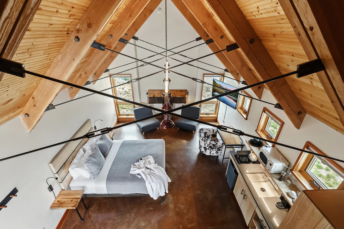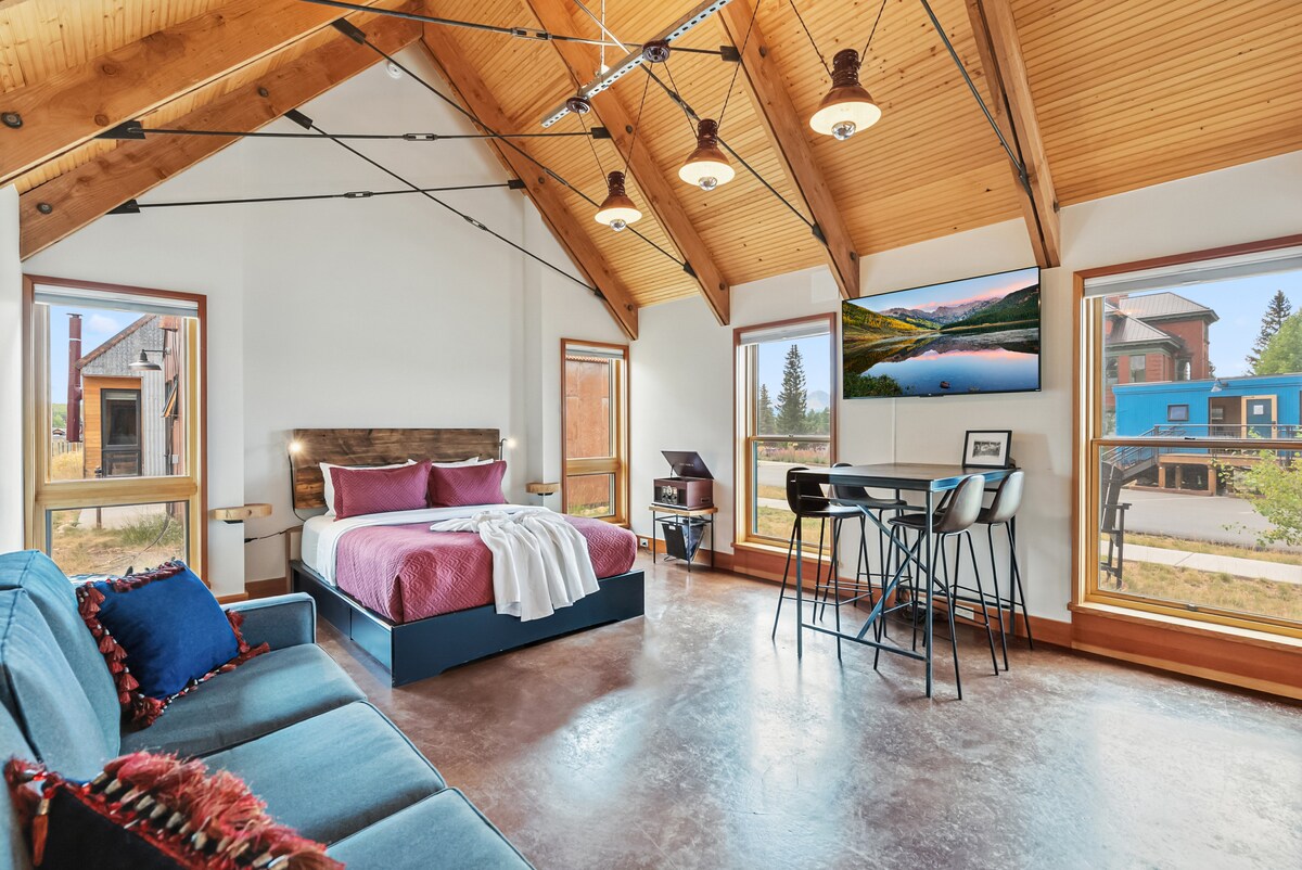 Nestled in the mountains of Leadville, Colorado, the S.L.umber Yard at FREIGHT is the perfect retreat. The property, once home to a lumber yard and freight depot, now boasts a brilliantly renovated event space, outdoor stage, and thirteen luxurious cabins. Whether you're celebrating a big milestone or just looking for a getaway, the S.L.umber Yard is the perfect place to stay. This cabin has one King bed and two chairs that fold out into kid-sized twins, perfect for two adults and two children.
