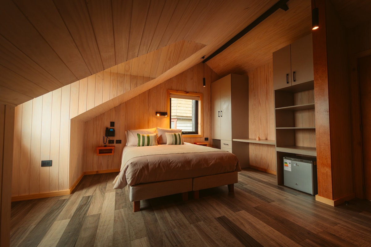 ¡Escápate a esta suite de lujo diseñada para el descanso total! La habitación cautiva con sus impresionantes ventanales de piso a techo que ofrecen vistas panorámicas inigualables a la naturaleza y el mar. Lo más especial es su tina independiente junto a la ventana, perfecta para relajarse mirando el paisaje. Disfruta de la calidez de la chimenea moderna bajo hermosos techos de madera con vigas a la vista. Incluye zona de estar, frigobar y un baño elegante con doble lavabo y ducha moderna.