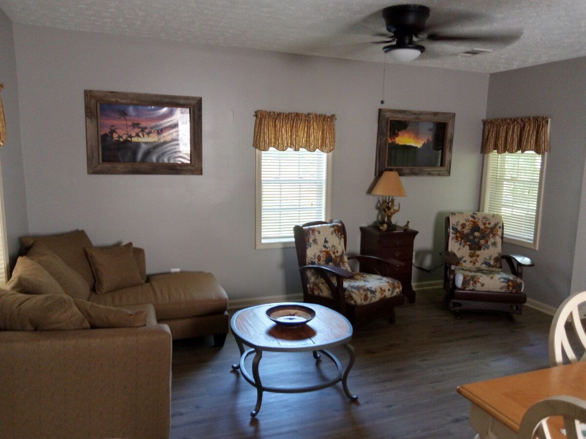 Grazioso appartamento tranquillo con giardino e accesso al lago Olympia, Buchanan, Georgia. Dimentica ogni preoccupazione in questo ampio spazio accogliente e sereno. Servizi: camera da letto principale con letto matrimoniale e divano letto, bagno con doccia a pioggia, doccia a mano, WC con bidet, seconda camera da letto con letti a castello, cucina con mini frigo, tostapane, forno a microonde, macchina da caffè Keurig, bollitore, macchina per il ghiaccio, soggiorno/sala da pranzo con tavolo in vetro, tavolini, divano, stufa a legna. Jacuzzi all'aperto.