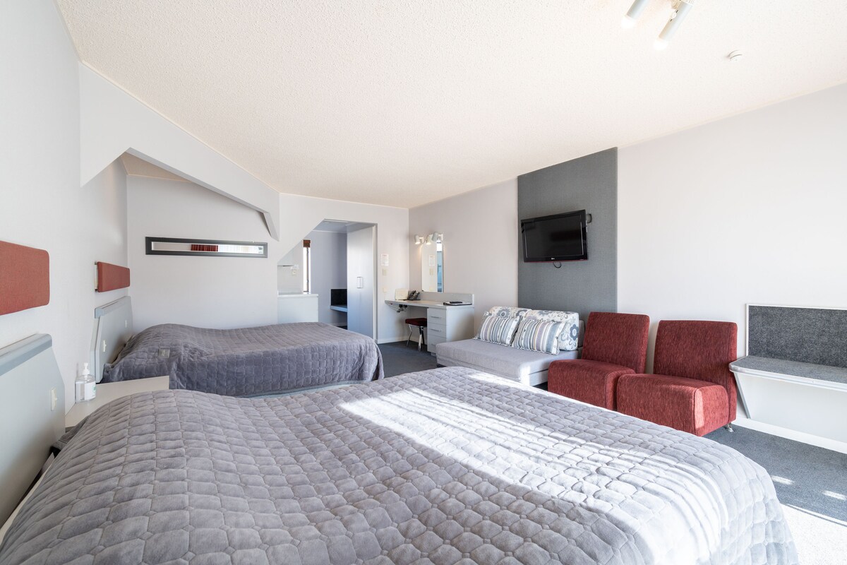 Alpenhorn Motel - Family Unit 6 offre sistemazioni spaziose e confortevoli, ideali per le famiglie in visita a Te Anau. L'unità dispone di un letto matrimoniale nella zona giorno principale e di due letti singoli in una camera da letto separata, con la possibilità di richiedere un letto pieghevole, se necessario. L'angolo cottura completamente attrezzato include un forno a microonde, un frigorifero e utensili di base, perfetti per preparare pasti semplici. Gli ospiti possono inoltre usufruire di connessione wi-fi gratuita e Smart TV, che offre accesso a servizi di streaming per l'intrattenimento.