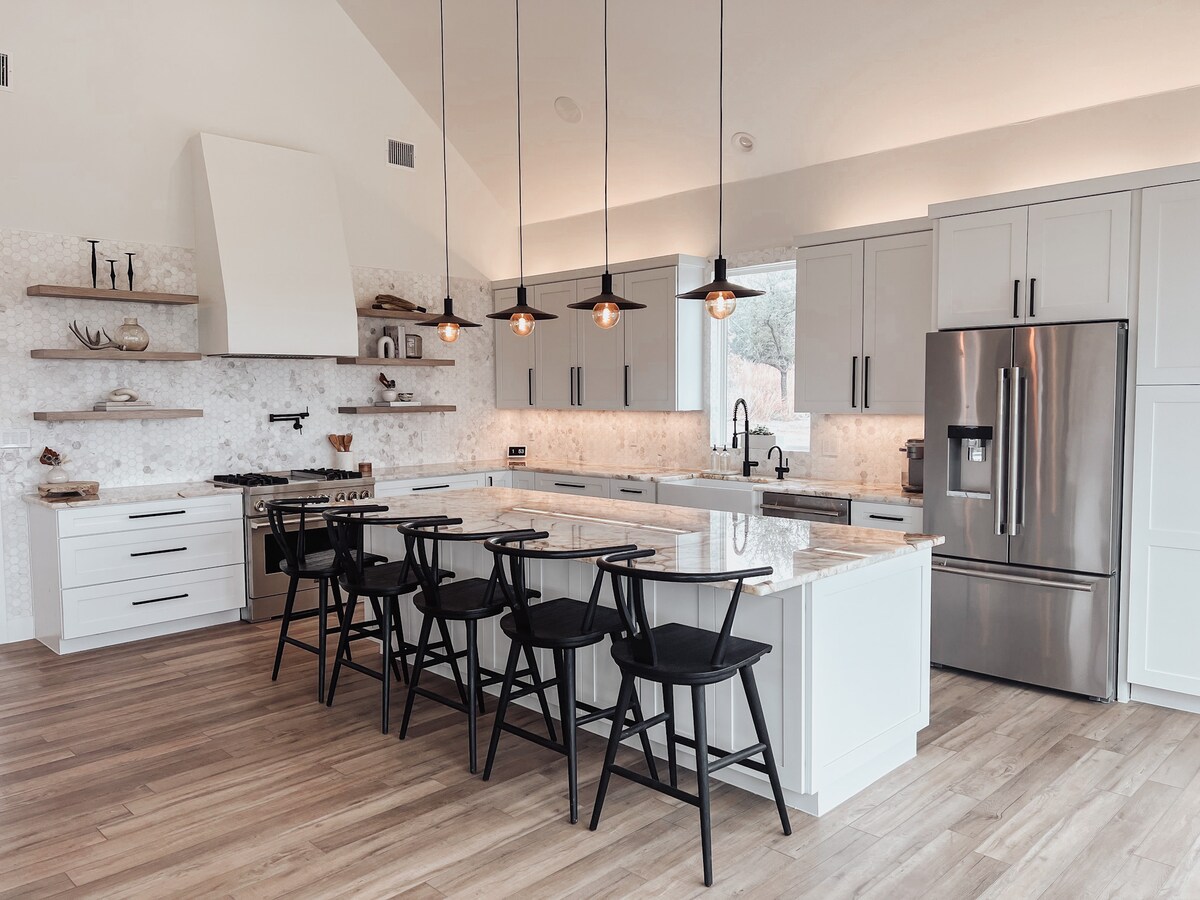 La luce naturale abbonda in questa moderna casa di campagna in collina! Esplora 9 ettari di splendide querce e fiori selvatici stagionali. Immergiti nella tua vasca idromassaggio privata sul crinale o fai un tuffo rinfrescante nella piscina. Il divano all'aperto è posizionato per il miglior birdwatching e la lettura di libri. Griglia all'aperto, cucina all'interno o avventurati in una delle vicine cantine, distillerie o ristoranti. Ma quando il sole si abbassa, preparati a tramonti impareggiabili e al cielo più stellato del Texas! Benvenuti in paradiso!