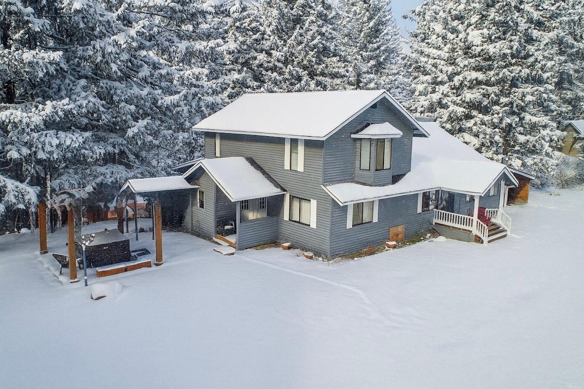 Lake & Mountain View cabin on quiet road. Fast WIFI! 4 live-stream flatscreens, including all bedrooms! Free NETFLIX A contemporary upscale design with rustic animal themes. 2 levels, windows facing the lake and mountains, pellet stove, central air. Master bed overlooking lake, with adjacent bathroom. 5 beds. Deck w/ 40 jet Clearwater spa, firepit & seating area. Hike or cross c.-ski right out the door. Snowmobile up Roslyn ridge! Note: Thanksgiving: 4 days required. 3 day weekends=3 nites.