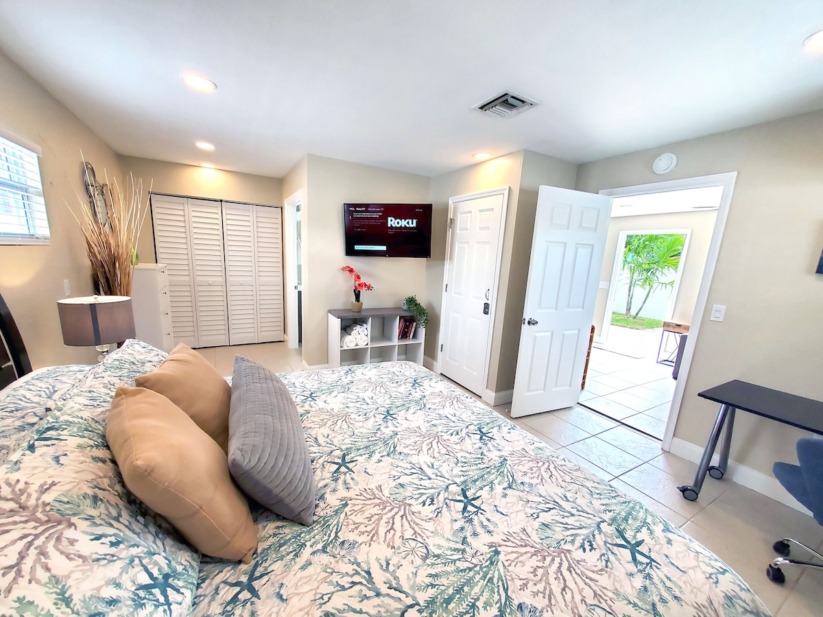 Ti diamo il benvenuto nel nostro monolocale completamente ristrutturato! È il luogo perfetto per un soggiorno rilassante e comodo nella soleggiata contea di Palm Beach. Goditi un bagno con doccia HydroJet e una cucina completamente attrezzata con tutto il necessario per sentirti a casa. Facile accesso a tutte le attrazioni della zona. In pochi minuti, è possibile raggiungere l'aeroporto, la spiaggia, ristoranti, supermercati, parchi e le principali autostrade I-95 e FL Turnpike. Offriamo check-in alle 13:00, letto matrimoniale e 1 posto auto
