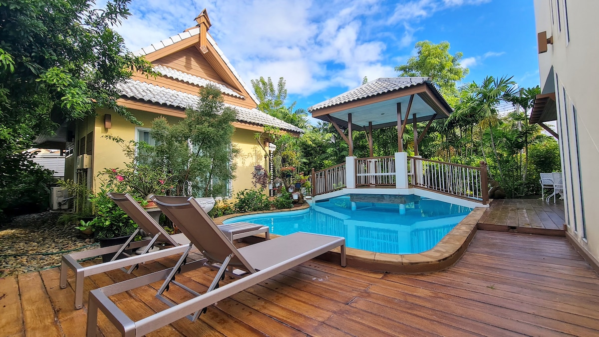 La nostra splendida villa è una fuga perfetta per amici e parenti. È dotato di condizionatori, cucina, scrivania, piscina privata e ampio giardino verde. La nostra famiglia come architetti ha costruito questo posto come casa vacanze. E ora vogliamo condividerla con chiunque, per godersi il proprio soggiorno a Chiang Mai. La casa si trova vicino alla riva del fiume di un quartiere locale. Saremmo più che lieti di avere te, i tuoi amici e la tua famiglia a Baan Thip Villa. Per ulteriori dettagli, leggi qui di seguito: