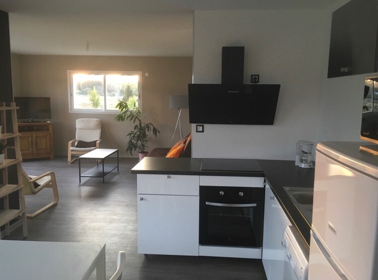Haut de villa de 63m2 + terrasse à 500M du centre du village, très lumineux avec de grandes ouvertures et une vue imprenable sur la campagne. Il se compose d'une grande pièce à vivre avec une cuisine toute équipée et un coin salon avec télé et clic clac, une chambre, une buanderie et SDB (douche) et WC séparés. LINGE DE LIT FOURNI JUILLET AOUT SAMEDI AU SAMEDI UNIQUEMENT Le chauffage est controlé par moi même est sera réglé entre 20 et 21 degrés. Cafetière SENSEO