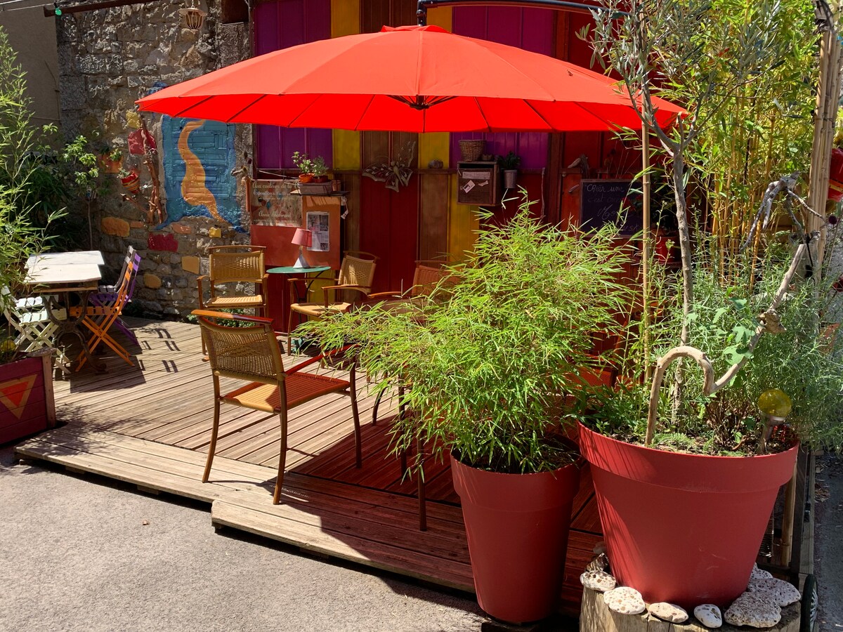 Alloggio insolito in un'atmosfera "hobbit" nascosto in fondo a un giardino selvaggio con vista sulla città. Si accede attraverso un sentiero escursionistico (in pendenza). L'alloggio è composto da un soggiorno con camino, una piccola cucina, una nicchia per la camera da letto, un piccolo bagno, una terrazza con vista sulla valle e la città (a 1 km), e novità, un bagno riscaldato a legna (tranne che in estate) Candele e musica sono a disposizione per creare l'atmosfera Ideale per un soggiorno romantico o un momento fuori dal tempo!