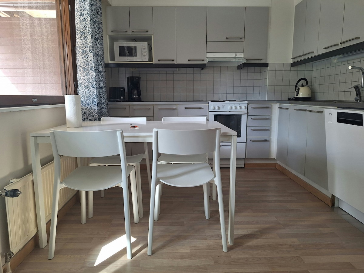 Appartamento a due piani in posizione centrale, con tutti i servizi per 6-8 persone. La cucina è stata recentemente ristrutturata di recente. L'appartamento ha due piani. Il piano terra/piano terra ha una cucina a vista con camino, una zona pranzo e un soggiorno. Al piano di sotto c'è anche una camera per due e il divano nel soggiorno può essere steso come letto aggiuntivo per due persone. Scale conducono al secondo piano con un loft aperto e una camera da letto separata con due letti singoli ciascuna.