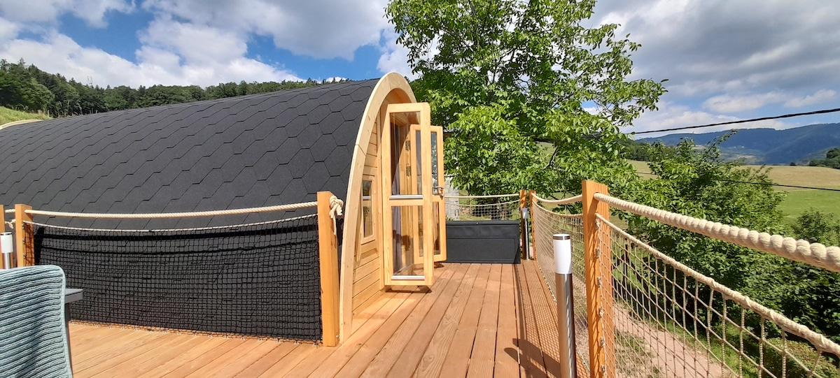 Chi non ha mai sognato di dormire a testa in giù tra le stelle? La cupola si trova a 840 metri sul livello del mare nel cuore della foresta dei Vosgi, isolata da qualsiasi vicino, per una calma ottimale. Situato su una terrazza in legno, in fondo alla nostra fattoria e nel cuore del parco degli alpaca, venite a ricaricarvi in un luogo armonioso ed estetico. Al calar della notte, comodamente sistemato nel vostro letto, ammirate l'affascinante spettacolo dello scintillio delle stelle e vibrate ai suoni della natura.