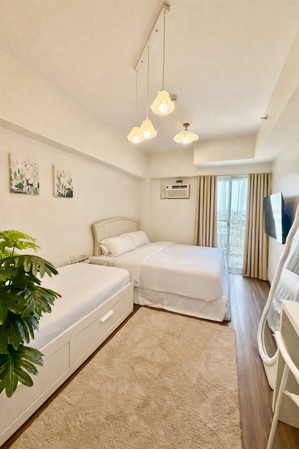 Scopri il lusso moderno in questo monolocale chic e luminoso. Perfettamente ottimizzato per il comfort, è dotato di un lussuoso letto matrimoniale, un accogliente divano e un elegante spazio di lavoro sotto una TV 4K da 55". È proprio di fronte a SM Southmall per le tue esigenze di ristorazione, shopping e intrattenimento. In evidenza: Design elegante: splendidi lampadari di cristallo con ventilatore e dettagli dorati. Completamente attrezzato: cucina compatta con forno a microonde, frigorifero e piano cottura. Comfort premium: ante a specchio, tende oscuranti e aria condizionata.