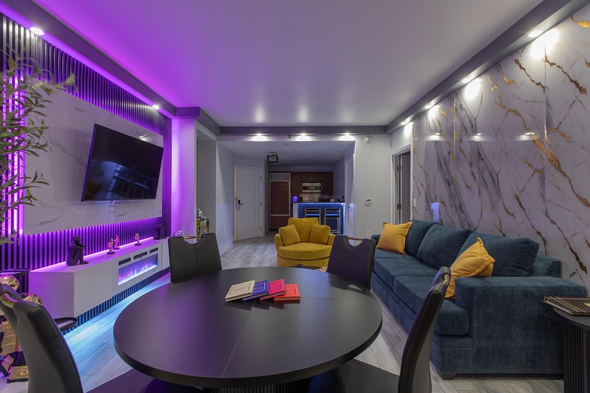 Scopri una suite unica nel suo genere a Las Vegas... Design e arredi mozzafiato con mobili di lusso in stile metà secolo. La planimetria a pianta aperta dispone di 2 camere da letto, 2 bagni e una superficie di 195 metri quadrati. Goditi l'intrattenimento 24 ore su 24 sul tavolo da biliardo in acciaio inossidabile e sul gioco arcade a più lati (i migliori giochi classici degli anni '80/'90). La zona giorno dispone di un ampio divano componibile, TV LG da 65 pollici e illuminazione a LED ovunque. La terrazza panoramica si affaccia sulla piscina interna/esterna e sulla Strip di Las Vegas.