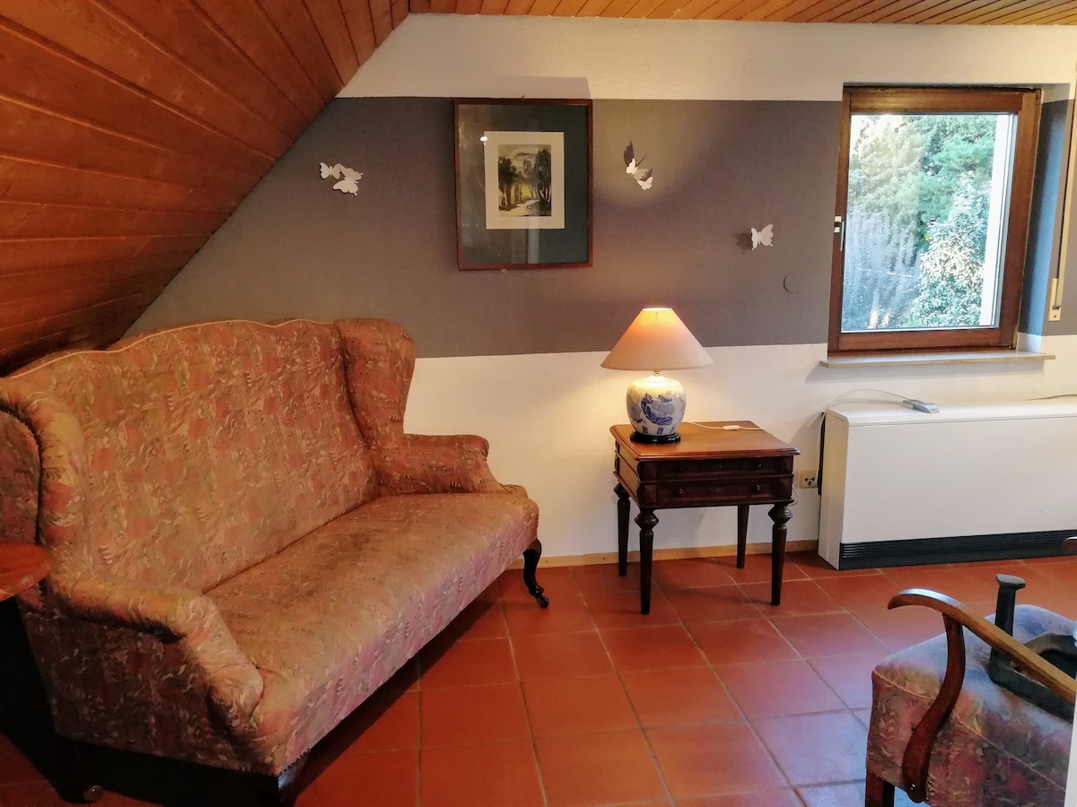 Rilassati in questo alloggio speciale e tranquillo. L'appartamento mansardato al 2° piano offre 2 camere da letto 1 soggiorno e sala da pranzo, cucina e bagno. La casa è una nuova costruzione e di conseguenza l'arredamento è in colori luminosi e accoglienti. L'appartamento si trova in una posizione tranquilla e gode di una bellissima vista sul verde, dove è possibile rilassarsi dalla vita di tutti i giorni. Dotazione: riscaldamento a pavimento, cucina completa incl. stoviglie, ecc. doccia a pavimento, finestre a tutta altezza nella zona soggiorno-cucina e pranzo.