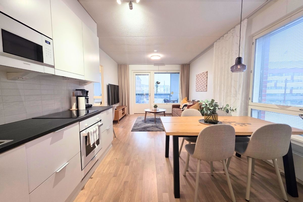 Goditi un soggiorno accogliente in questa struttura centrale. Un appartamento luminoso e bello, dove ti troverai sicuramente a tuo agio! Dall'appartamento si accede direttamente alla riva del lago Jyväsjärvi e i servizi portuali e il centro fieristico del padiglione si trovano a 5 minuti a piedi. La via principale del centro città si trova a circa 10 minuti a piedi. Oltre alla posizione centrale, potrai godere di un ambiente tranquillo, dove la vista sul bellissimo paesaggio lacustre si apre direttamente dalle finestre dell'appartamento.