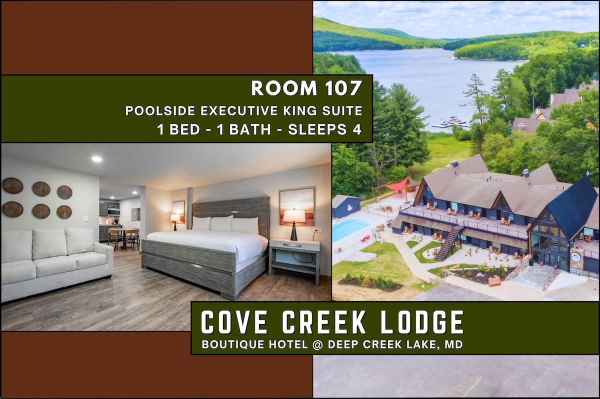Comfort e comodità da ogni angolazione, questo rifugio suite a bordo piscina ti offre l'accesso a tutto in pochi passi. Stenditi nel soffice letto matrimoniale grande e riposati per la tua prossima avventura sul lago. Questa suite dispone anche di un divano letto matrimoniale per uno spazio aggiuntivo per dormire. Dotato di cucina completa per cucinare i pasti, Smart TV, e un lussuoso bagno con cabina doccia e prodotti da bagno di qualità. Cammina fino al tuo patio privato per due e goditi l'aria fresca di montagna prima di dirigerti
