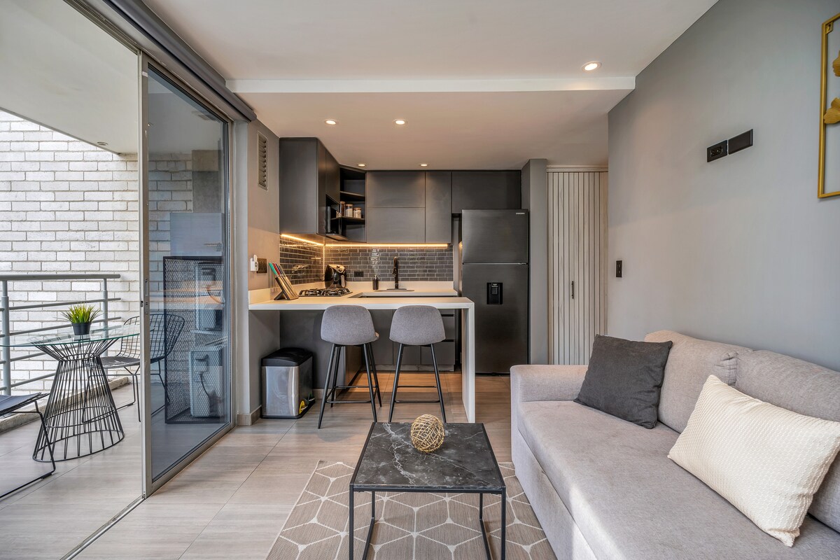 BENVENUTI IN UN APPARTAMENTO Nuovissimo monolocale a Laureles - distretto superiore di Medellín! Questo rustico studio industriale è in egual misura chic e rilassante con un elegante design modernista e caldi accenti di legno. Per il vostro comfort utilizzare la nostra vasca idromassaggio rilassante e frizzante tutte le volte che vuoi. Poi vai a dormire in un letto queen-size con le nostre lenzuola di lusso. L'atmosfera è perfetta per giovani professionisti, studenti, coppie, nomadi digitali o amici che cercano uno spazio economico in una posizione privilegiata.