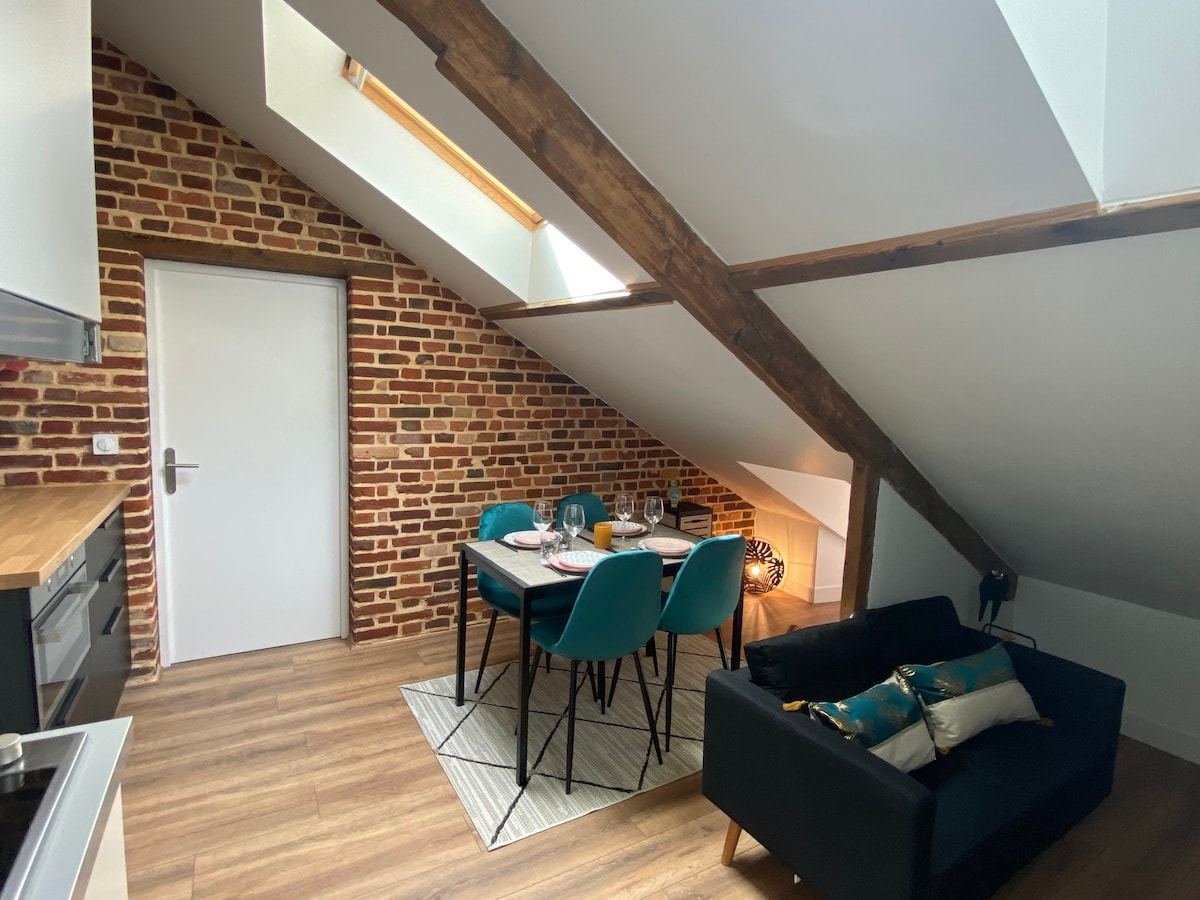 Grazioso appartamento situato in una vecchia casa a schiera, immerso in un tranquillo quartiere residenziale. Nascosto sotto il tetto (al 3° piano senza ascensore), offre tutti i comfort (bagno, servizi igienici, angolo cottura) e un ingresso privato. Inondato di luce naturale, questo spazio luminoso e rilassante offre un'atmosfera calda e accogliente, con mobili confortevoli, toni armoniosi e adatto ai bambini.
