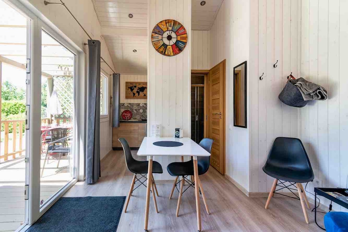 Chalet in legno completamente arredato e indipendente Un vero piccolo paradiso di 45 m² Zona notte con un ampio letto 160x200 bagno con doccia Se necessario, il divano letto offre un secondo posto letto.cucina attrezzata condizionamento reversibile WIFI gratuito fibra A 2 minuti a piedi dal fiume per una breve passeggiata.Negozi nel villaggio: VIVAL aperto 7 giorni su 7 dalle 7:00 alle 20:00 Panificio, ristoranti Parcheggio gratuito