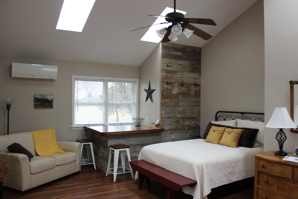 La Carriage House è il primo piano delle nostre scuderie di cedro che è stato trasformato in appartamento anni fa. È stato completamente ristrutturato e decorato professionalmente per renderlo un rifugio accogliente e lussuoso con una splendida vista. Anche se non usiamo più le scuderie per ospitare animali, teniamo comunque qualche capo di bestiame + pecore al pascolo per il tuo divertimento. La parete delle finestre sul retro dell'appartamento offre la vista più mozzafiato sui terreni agricoli circostanti e un'alba indimenticabile.