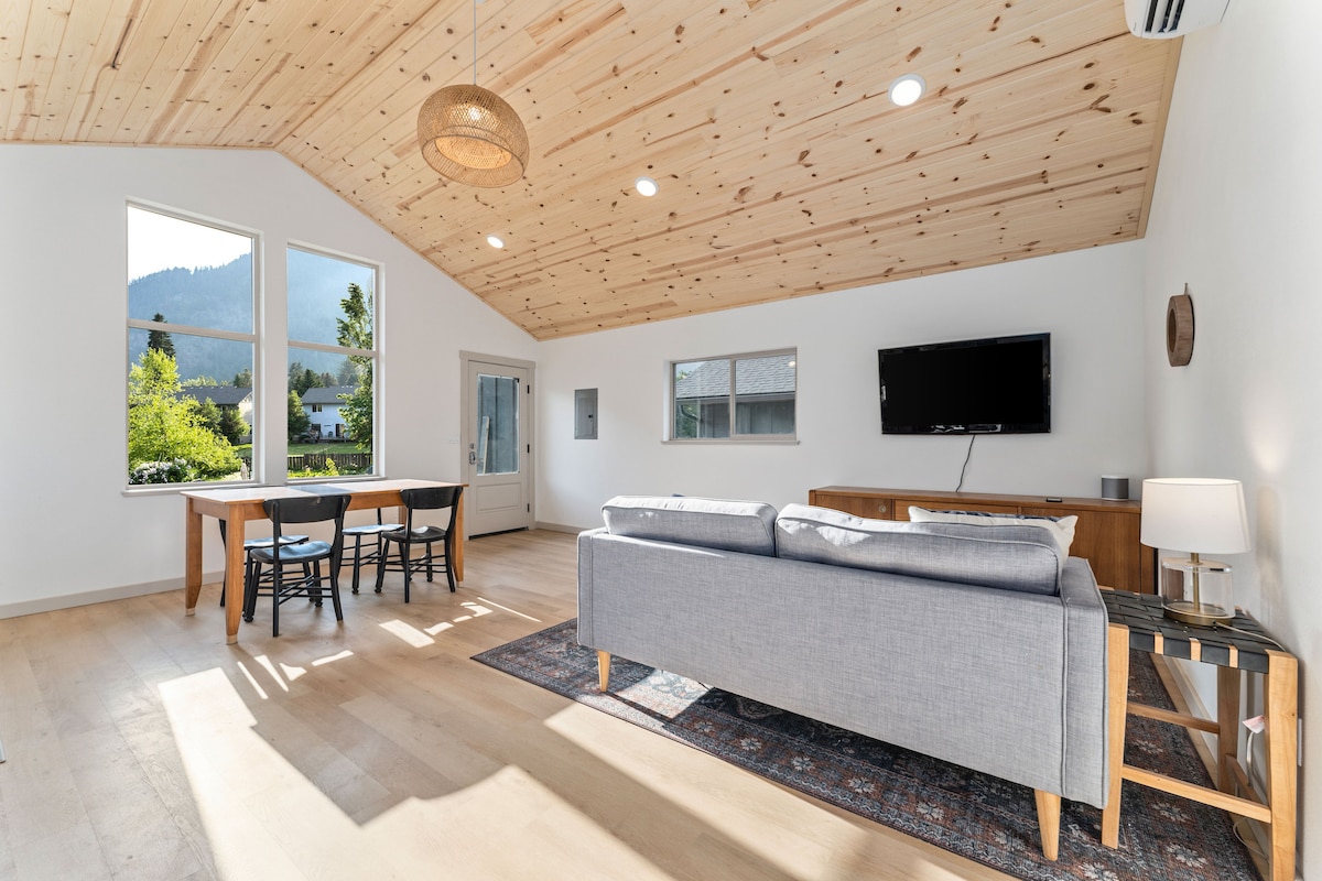 Massimo 2 adulti, 2 bambini. Pulito ed elegante al piano superiore con una camera da letto in un ADU indipendente, perfetto per una vacanza di coppia, una vacanza in famiglia o una base per avventure. A soli due isolati dai negozi, ristoranti, caffè e luci natalizie del villaggio: non serve l'auto! Raggiungi a piedi il Riverfront Park, con sentieri, aree picnic e parco giochi. Dispone di un letto king-size e di un comodo divano letto queen-size per una notte riposante in una posizione tranquilla e affascinante. *i proprietari vivono nella proprietà *Gli adulti aggiuntivi costano 50 USD a persona al giorno previa approvazione
