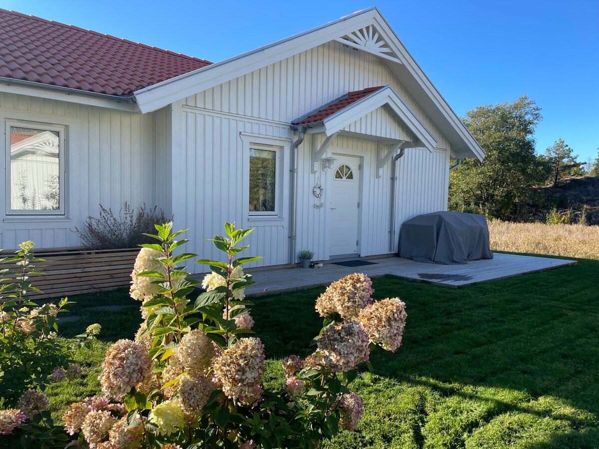 Kök och allrum med 155 cm dagsäng och havsutsikt. Stort sovrum med 160 cm dubbelsäng. Kök med ugn/induksjonshäll, kyl/frys, disk och micro. Bad med dusch, tvättmaskin och torktumlare. Altan och stor uteplats med gräs. Parkering utanför. 10 minuters gånge til vattnet med stränder, klippor och båthamn, skogen 1 minut bakom huset. 15 min att köra til centrum, 10 minuter til Nordby shopping. 20 minuter till Koster med båt. Lugnt område.