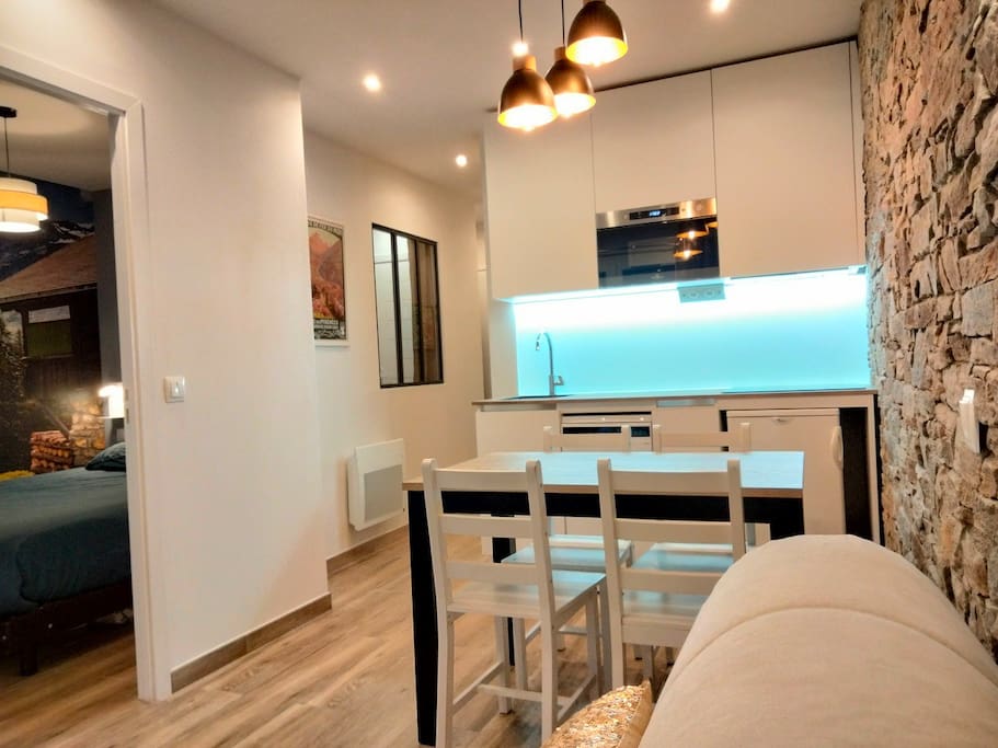 Appartamento di 39 m2 ristrutturato nel 2019 nel centro della località vicino al centro della città. Accanto a una fermata della navetta per la stazione. Negozi ai piedi del residence. Piste e centro Balneare e spa Angleo a 2 minuti con navetta gratuita e auto e 10 minuti a piedi. 6 posti letto: una camera da letto con un grande letto di 140x200 spogliatoio e TV, un soggiorno con cucina attrezzata, TV e un divano letto di 160x200 e una piccola camera da letto con 2 letti a castello di 90x190. Attenzione: niente lenzuola né wifi.
