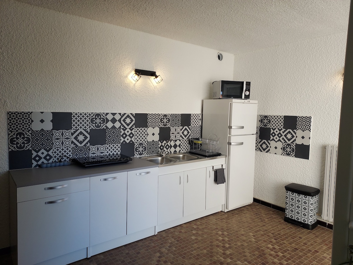 F2 composto da 1 stanza con cucina attrezzata: piastra induzione 2 zone, frigorifero con vano congelatore, microonde, bollitore, tostapane, Senseo Televisione TNT, BZ 140 1 camera con letto 160 1 bagno con doccia, WC separato Biancheria da bagno e da letto fornita Lettino pieghevole, ferro da stiro su richiesta Ingresso indipendente L'alloggio è da lasciare pulito
