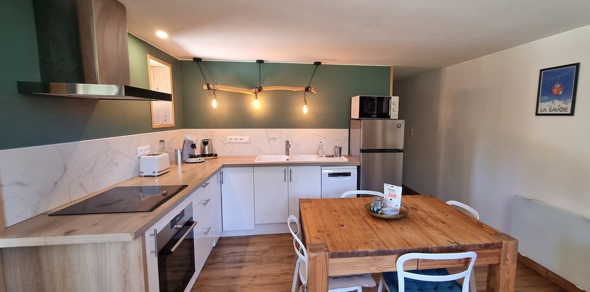 Bel appartement "ambiance chalet" de 30m2, au rez-de-chaussée de notre maison individuelle, au calme avec parking privé et vu montagne. Notre logement est synonyme de sérénité, douceur et nature . Il est totalement équipé et refait à neuf composé : D'une chambre avec lit 2 places et commode Mezzanine avec un matelas 2 places (idéale pour des enfants) Petite Salle de bain, wc Espace salon/cuisine Une terrasse vu montagne.