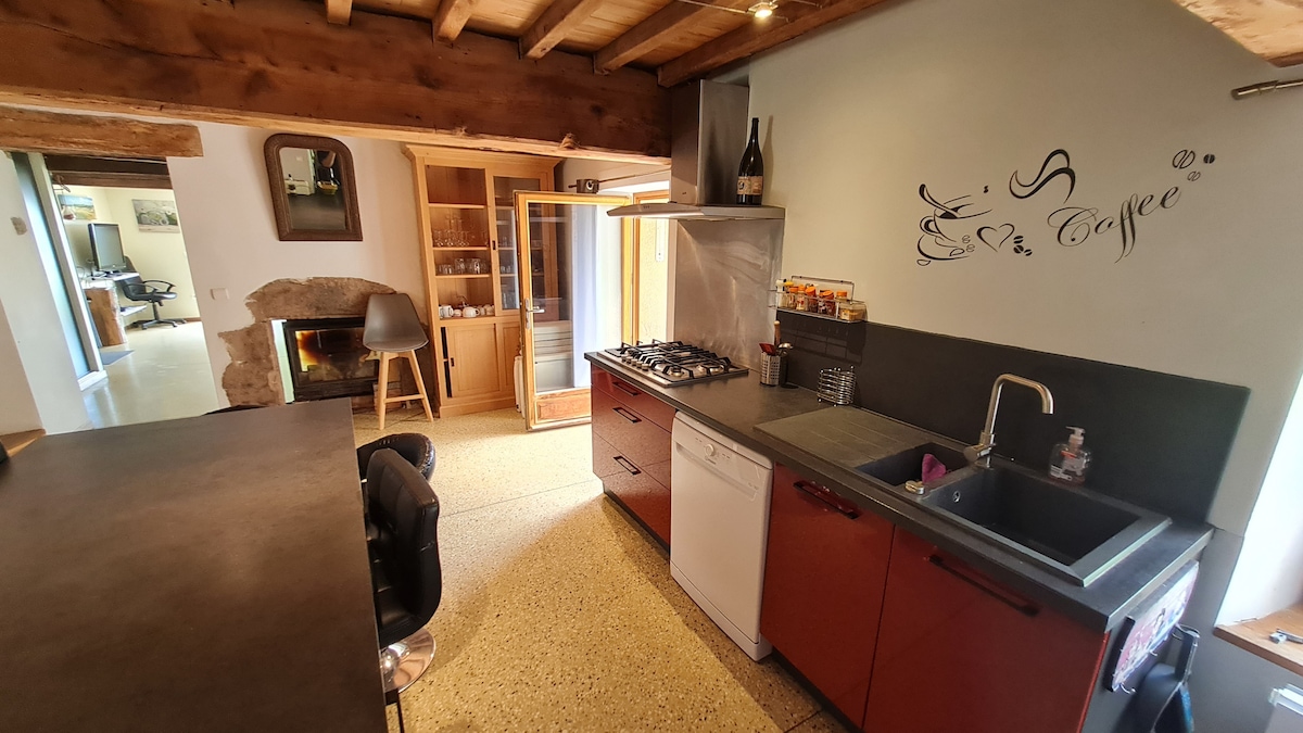 Offerta "vasca idromassaggio gratuita nei fine settimana"! Casa di 120 m2, wifi, TV connessa. Ideale per ricaricarsi in tranquillità in campagna per un soggiorno in famiglia o di lavoro. Caffè, tè, condimenti, olio, cereali, tè, sapone... a disposizione e un "piccolo negozio di alimentari". 4 camere da letto (una cieca) 1 cucina attrezzata (raclette, lavastoviglie, caffettiere a filtro e Tassimo). Soggiorno, bagno, wc sep. lavanderia. Arrivo autonomo possibile. Negozi. Pulizia e asciugamani non inclusi ma possibili a pagamento.