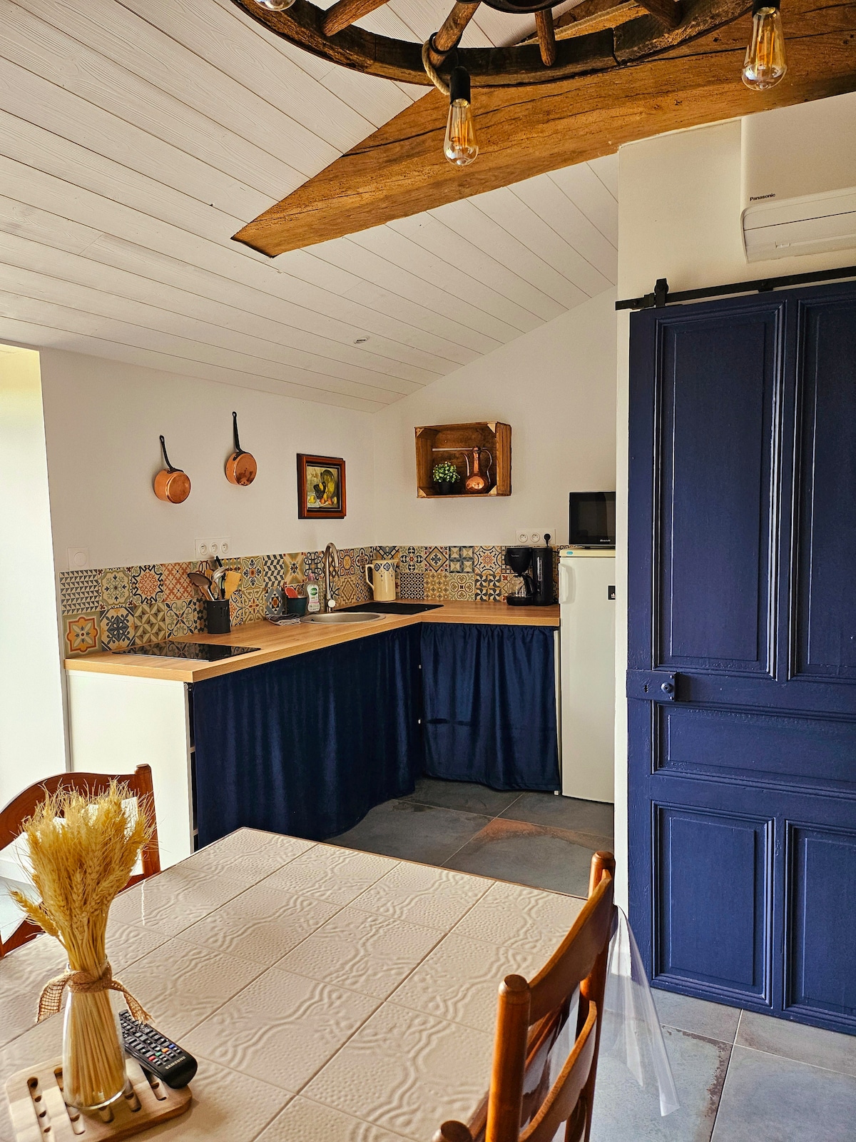 🏠 Alloggio indipendente ideale per 2/4 persone. Composto, su un unico livello, da un luminoso soggiorno di 24 m² con cucina attrezzata, soggiorno (divano letto Dunlopillo 130x190 cm) e zona ufficio. Un bagno con servizi igienici. Al piano superiore, un soppalco mansardato (ATTENZIONE altezza max. 1,85m) con 1 letto 160x190 cm e armadio. Terreno privato sul retro, per godersi il salotto da giardino e il barbecue. ✅️ Biancheria da letto e da bagno inclusa, prodotti di prima necessità in loco.