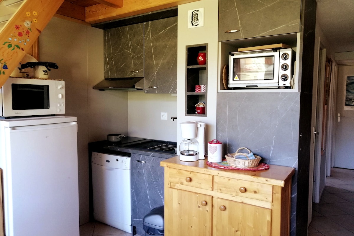 Questo appartamento di 27m² situato nel quartiere di Preyerand è ideale per 4 a 6 persone. Descrizione dell'alloggio: - Soggiorno con cucina (forno, microonde, piano cottura a induzione, lavastoviglie) divano letto 160X200cm (2 pers.) accesso al balcone da una porta finestra - Camera con un letto di 140X190cm (2 pers.) cassettiera + TV - Angolo montagna 2 letti a castello 80X190cm (2 pers.) + armadio - Bagno con doccia - WC La camera da letto e il soggiorno possono essere separati da una porta scorrevole.