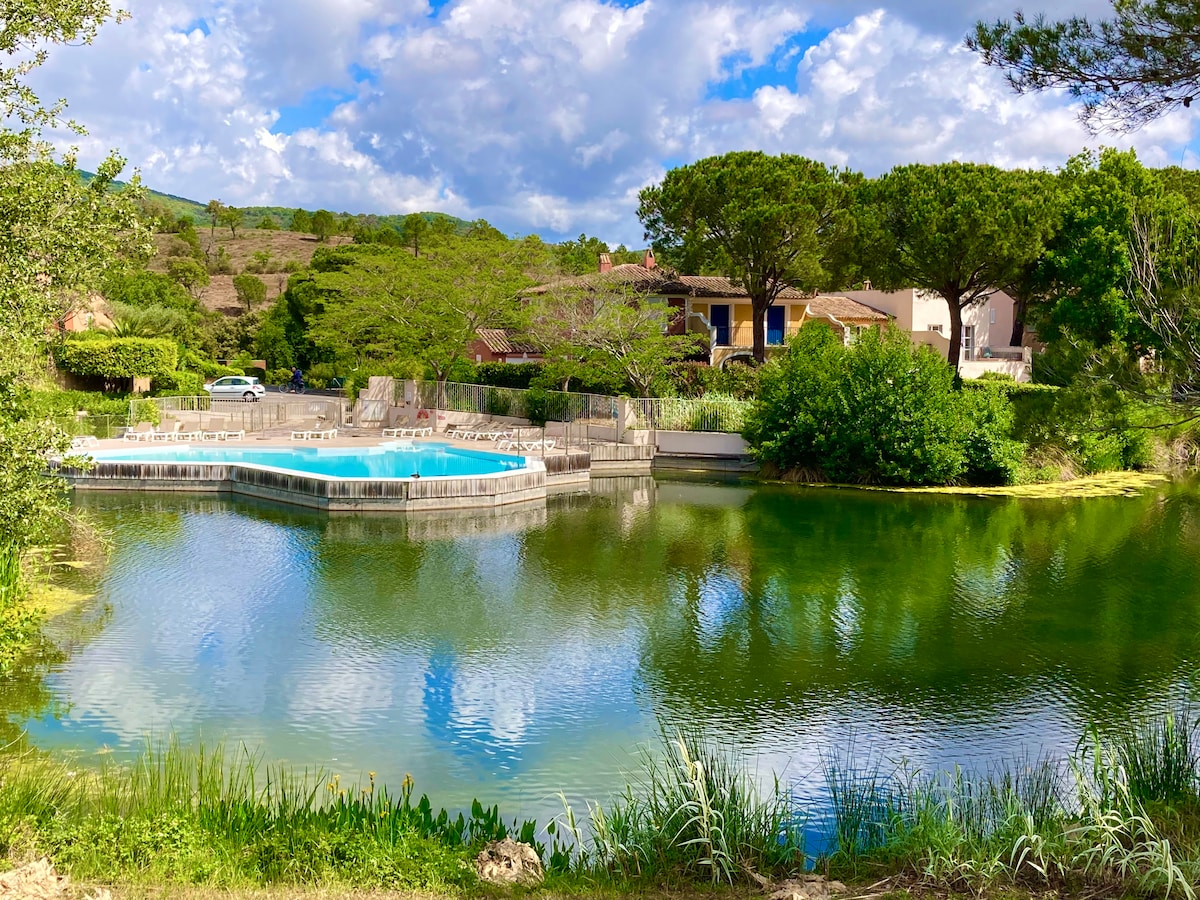 Ce logement paisible offre un séjour détente pour toute la famille dans un domaine arboré privé de 25 Ha et sécurisé avec gardien, 3 piscines dont une à vague, terrains de: tennis, basket,foot,beach volley... un bar cocktail crêpes snack , une laverie, une superette, animations juillet/Aout, plages à 800 mètres, 8 kms de St tropez ...maison entièrement climatisée,en bord de lac,avec terrasse et plancha... Amandine et Yohann se font un plaisir d'ouvrir leur maison.