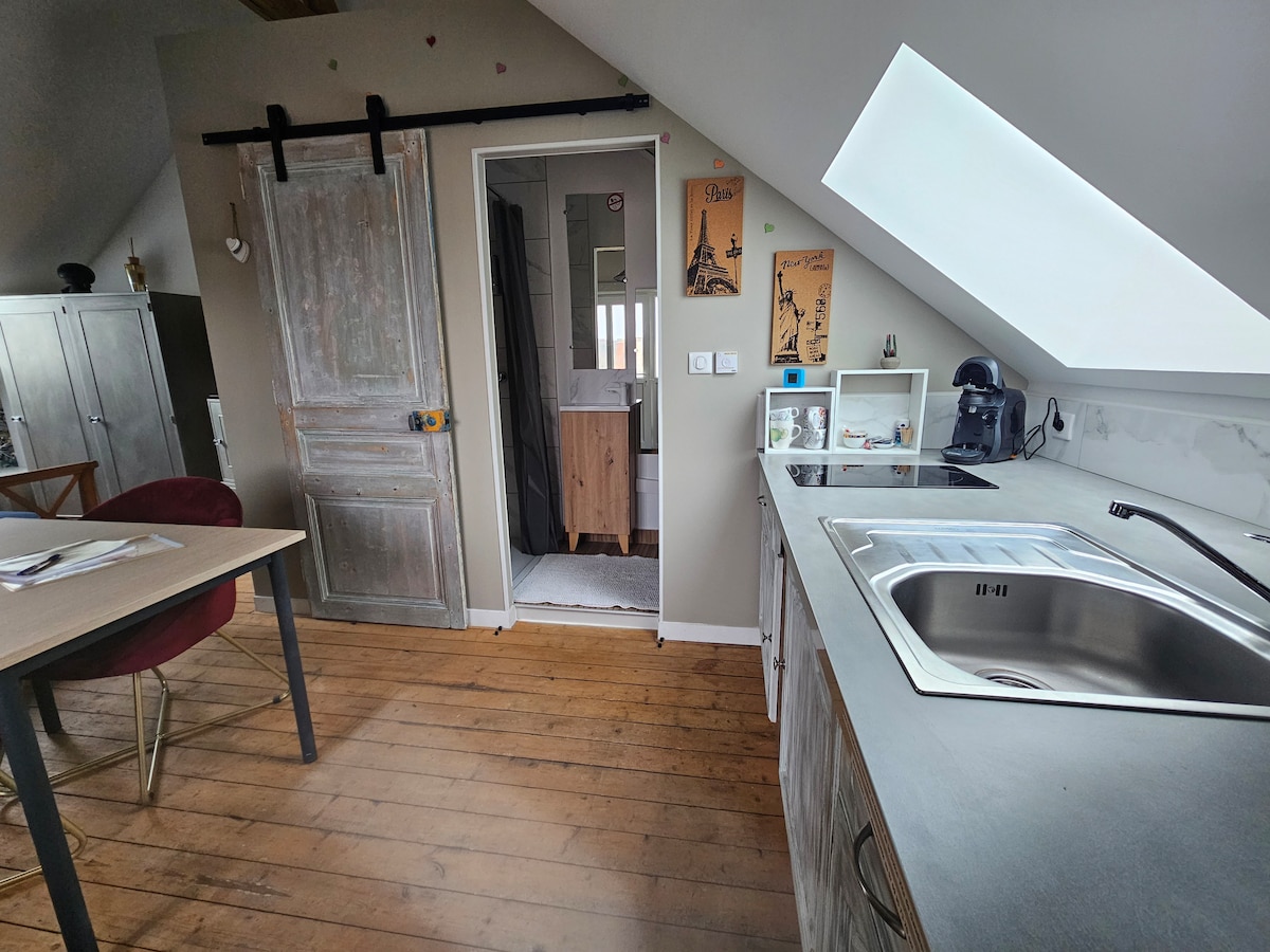 Rilassatevi in questo alloggio tranquillo ed elegante con una vista tranquilla sulla campagna. Potete arrivarci anche di notte perché c'è una cassetta delle chiavi. Siamo al vostro ascolto. Letti singoli o letto matrimoniale. Lavoratori, coppia, coppia con 1 bambino, arrivi flessibili, non esitate a contattarci. Abbiamo altri cottage e camere se ci sono grandi eventi nella zona.