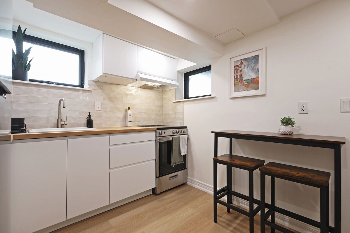 Goditi un appartamento seminterrato di nuova costruzione, progettato professionalmente e spazioso con 1 camera da letto a East York, Toronto. Situato in posizione strategica vicino a Danforth, Woodbine Beach, parchi e sentieri, l'appartamento dista un breve tragitto in autobus/metropolitana o 15 minuti di auto dal centro di Toronto. Indipendente e spazioso, offre una cucina completamente attrezzata, una nuova lavanderia, un letto matrimoniale, ampi spazi e molta luce naturale.