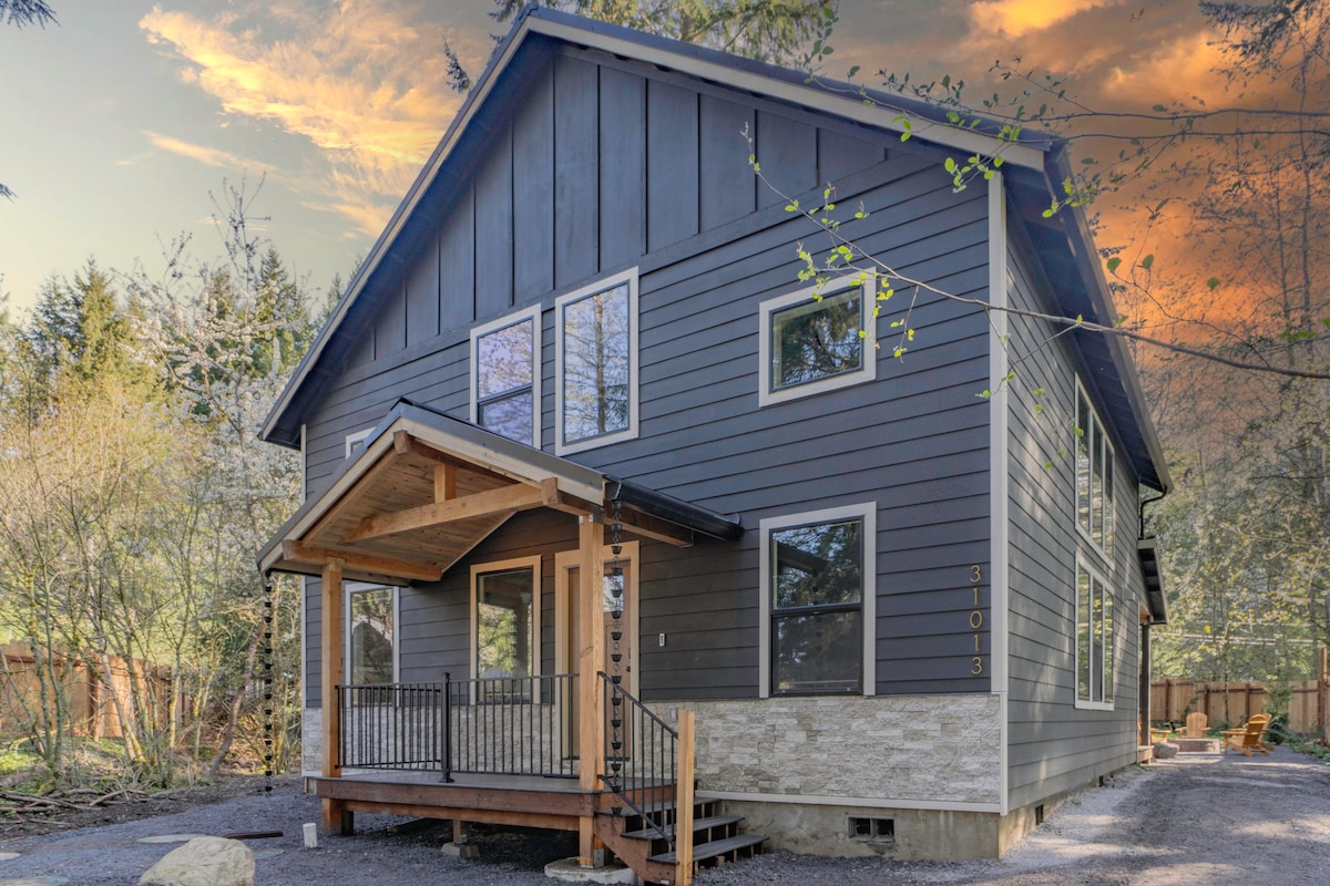 -Sleeps 8 -10 min’s to Mt Rainier -Large hot tub -First floor master (King) -Propane BBQ -Free Wi-Fi -Full kitchen -Air conditioning -Family friendly -EV charger II +Tesla -Outdoor fire -Covered patios -Smart TV's -Children's Play Area