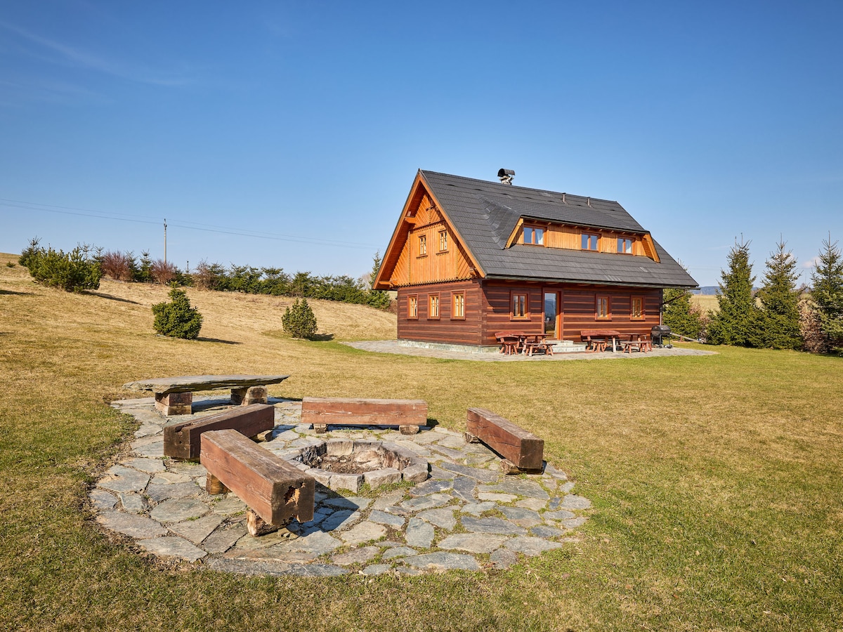 Elegante sistemazione nel cuore dei Monti Jizera, dove tutti possono trovarla - perfetta per gli amanti delle escursioni a piedi e in bicicletta, per un gruppo di amici e familiari con bambini, per chi ama l'adrenalina a Singltrek pod Smrkem e per chi cerca pace e relax nella natura..... o con il vino nella vasca idromassaggio. I bambini sono a casa: abbiamo pensato a loro. Troveranno una casa da parata con scivolo, una sabbiera, un letto a base di mirtilli, un ruscello privato e tutto il resto di cui potrebbero aver bisogno.