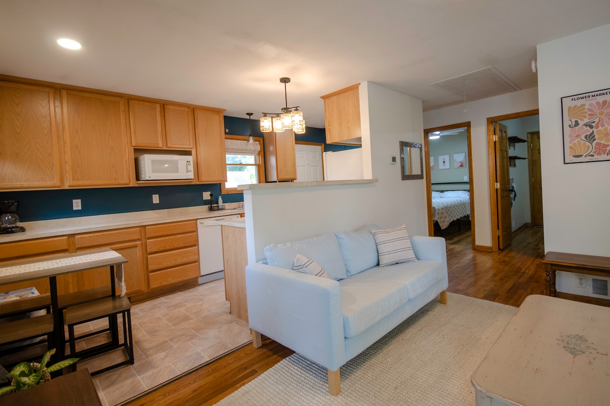 Benvenuto nella mia confortevole suite Airbnb 25x12 in un quartiere bello e sicuro, a 2 minuti dall'autostrada e a 20 minuti dall'aeroporto o dal centro di Kansas City. Il tuo spazio privato e il bagno si trovano appena oltre la porta d'ingresso, e sei letteralmente a 6 gradini dalla tua auto. Lo spazio include una cucina, una zona salotto e una zona notte con molta luce naturale. Il mio cortile anteriore ombreggiato ha una panchina e un'altalena, e c'è un bellissimo parco in fondo alla strada. Un sacco di negozi e ristoranti nel raggio di 3 miglia.