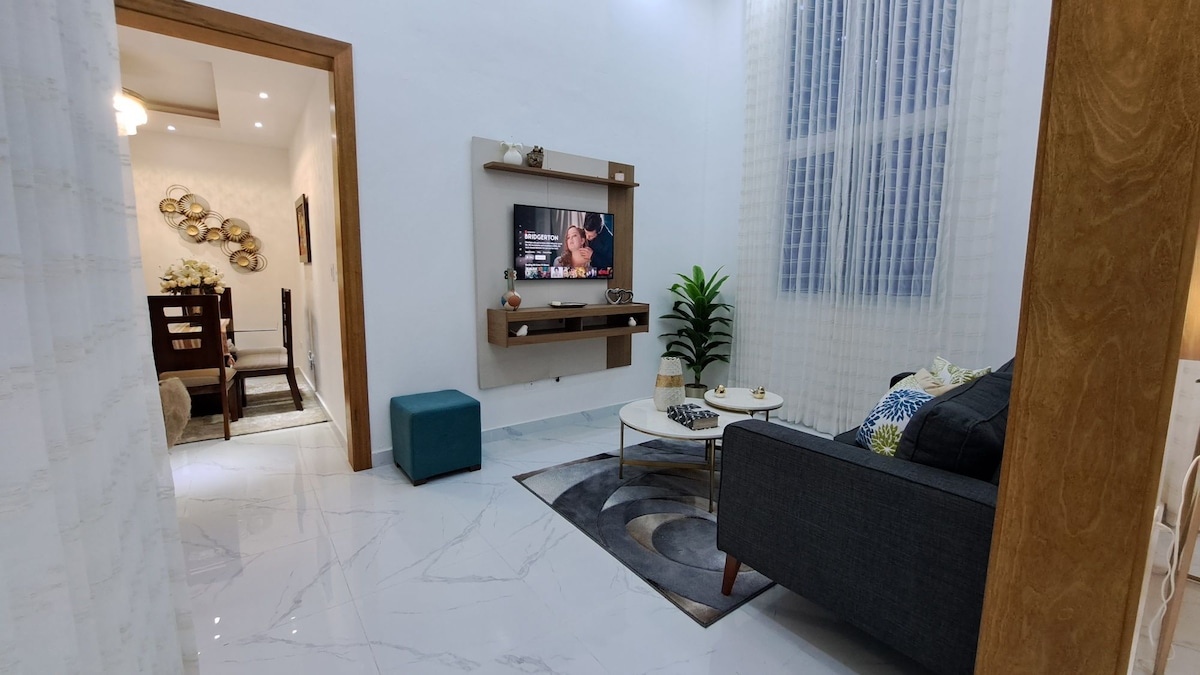 Questo nuovo appartamento è il soggiorno perfetto per una vacanza in famiglia e con gli amici. Si trova a 10 minuti dall'aeroporto di Santiago, è ricco di servizi e completamente arredato. Ci sono 3 bagni e mezzo, 3 camere da letto con aria condizionata e una camera per gli ospiti con letto singolo, ventilatore e bagno privato. Cucina completamente attrezzata, due salotti, aria condizionata, due smart TV da 50", altoparlanti Bluetooth e due posti auto. Potrai anche goderti i dintorni del complesso, come il parco giochi, la piscina, la sala eventi, il lago e il campo sportivo.
