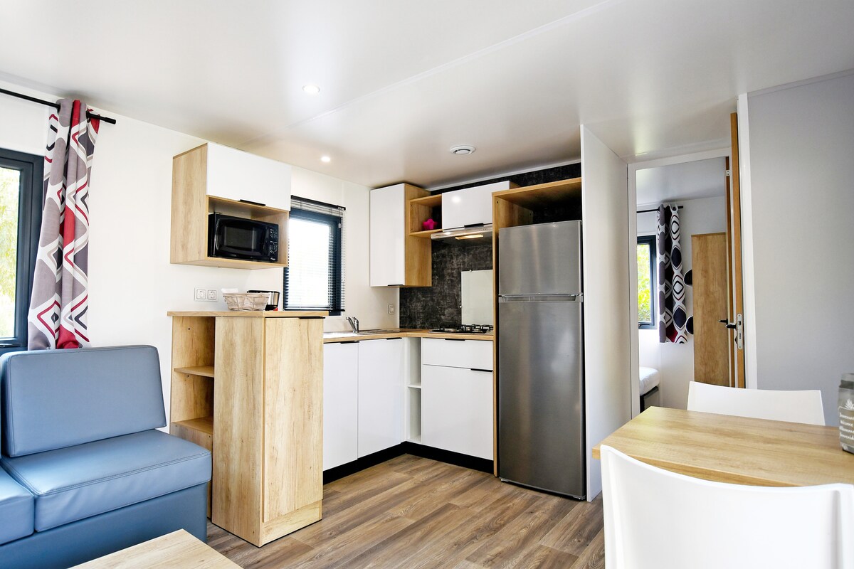 Questo alloggio per famiglie è vicino a tutti i siti e servizi. Mobile home di 33m² con terrazza pignone, ideale per 4 persone, composta da quattro stanze: Sala da pranzo con cucina attrezzata, bagno e due camere da letto accanto. (Un parentale con un letto grande e un secondo con due letti singoli) All'esterno una terrazza in legno coperta e mobili da giardino.