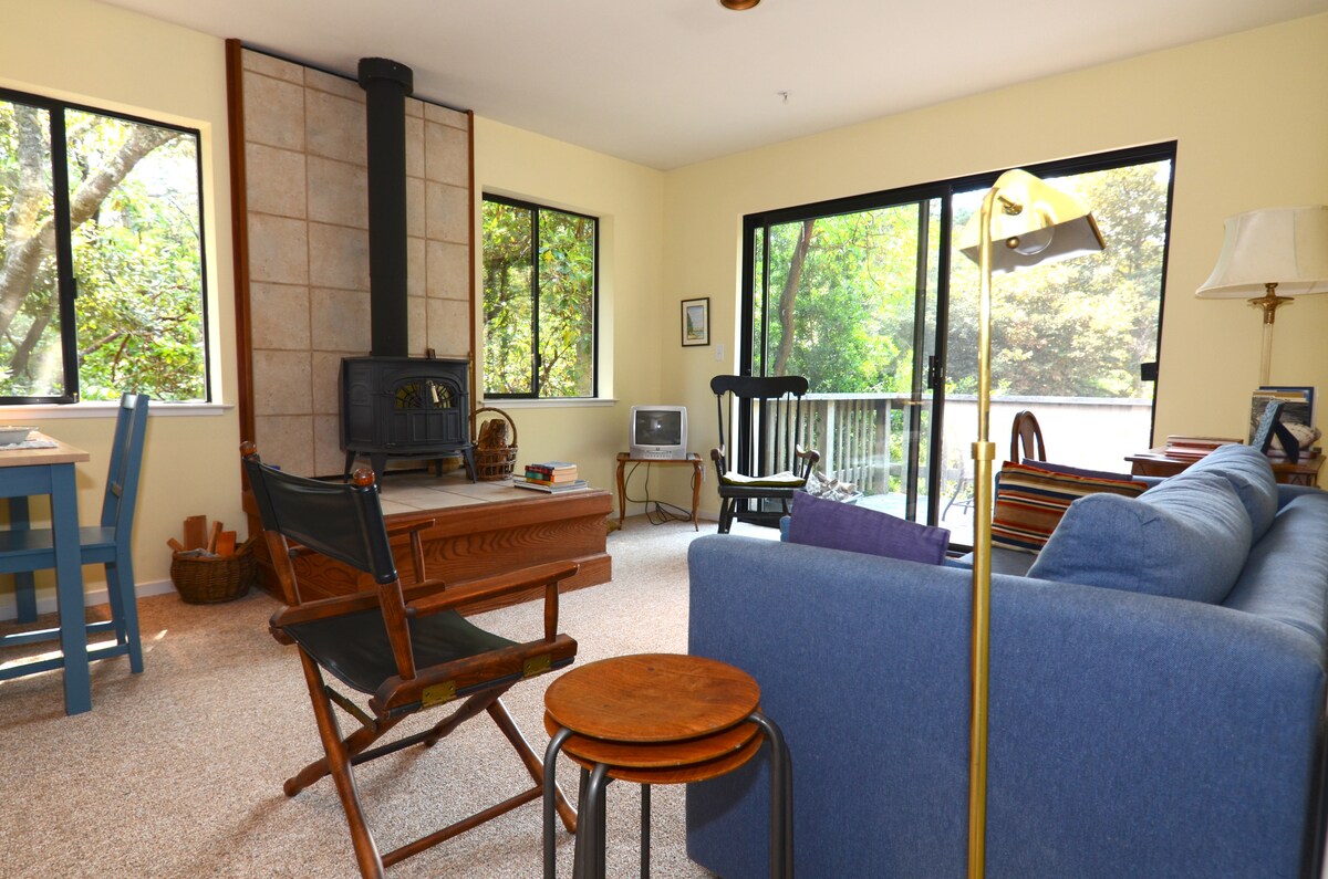 Sereno rifugio a West Marin, che chiamiamo amorevolmente L'il Zuma. Si trova in un maestoso bosco di sequoie nel cuore della valle di San Geronimo. Attraversa un ponte pedonale su un dolce torrente stagionale per trovare un'affascinante casa con interni moderni e personalizzati. Pianta aperta con lucernari, una camera da letto completa, un soppalco per dormire e accesso a terrazze che portano la natura in casa. Rilassati nel tuo magico rifugio privato. A pochi minuti da Fairfax e con facile accesso ai migliori parchi, piste ciclabili, sentieri escursionistici e spiagge di West Marin. La vita è bella!