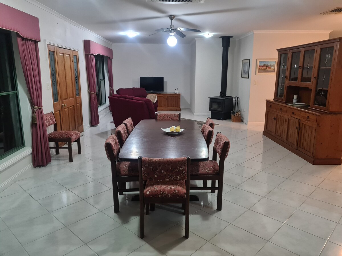 Dimentica le tue preoccupazioni in questo spazio spazio spazioso e sereno. C'è abbastanza spazio per tutta la famiglia e non solo. Metti in pausa il tuo viaggio tra Melbourne e Adelaide e respira l'aria di campagna di questa fattoria funzionante. Abbassati e rilassati in piscina vicino ai campi di colture stagionali mentre ti godi un barbecue. Prepara una tempesta nella grande cucina e lasciati proteggere da qualsiasi pioggia sotto la spaziosa zona pranzo all'aperto. Soggiorna ancora tra tramonti spettacolari e cori di fauna selvatica.