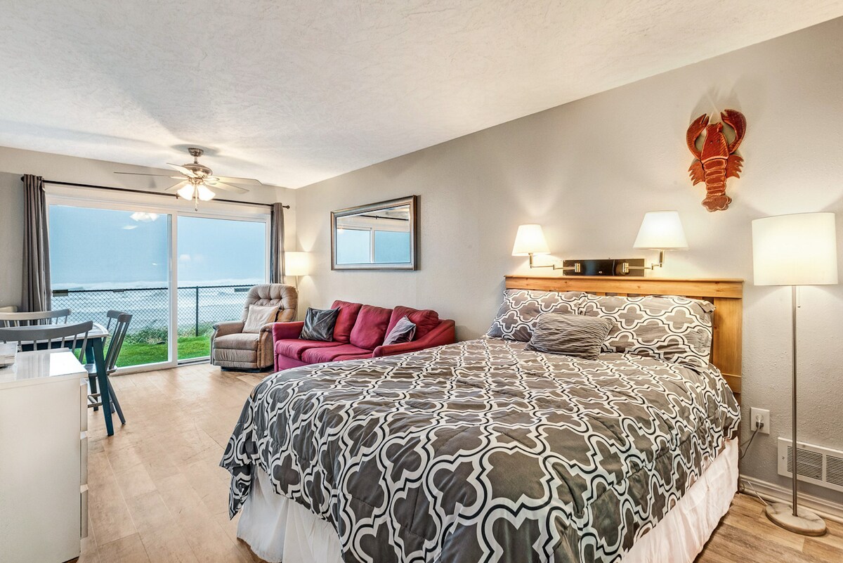 "Saving Pirate Ryan", Unit 102, è un monolocale al piano terra con una splendida vista sull'oceano e un patio per rilassarsi e guardare le onde. Questo appartamento è una delle poche unità al piano terra che vantano un letto king-size e una cabina doccia. Saving Pirate Ryan è dotato di un angolo cottura completamente rifornito con frigorifero a grandezza naturale, piano cottura e forno, caffettiera a goccia e forno a microonde, nonché di un piccolo tavolo da pranzo per permetterti di goderti un'esperienza culinaria sull'oceano comodamente dal tuo appartamento.