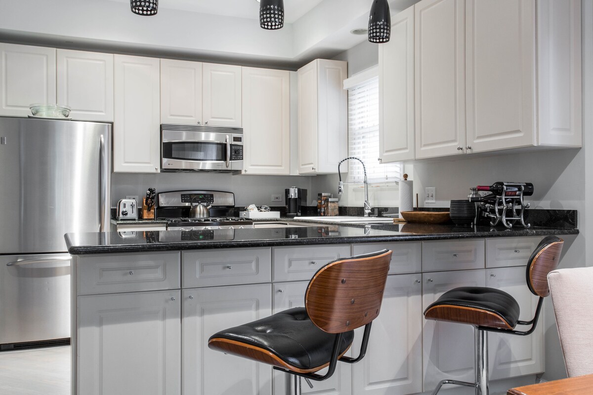 Questo luminoso e arioso appartamento con 2 camere da letto e 2 bagni è stato completamente ristrutturato con un occhio di design e un tocco creativo. L'appartamento è dotato di 1 posto auto nel parcheggio privato adiacente. Il patio coperto sul ponte posteriore offre una vista spettacolare sullo skyline di Chicago: goditi il tuo caffè mattutino o un cocktail serale con vista sulla città. L Fermate dei treni e tantissimi ristoranti, bar e divertimenti a pochi passi. Contattami per ricevere sconti sui soggiorni mensili!