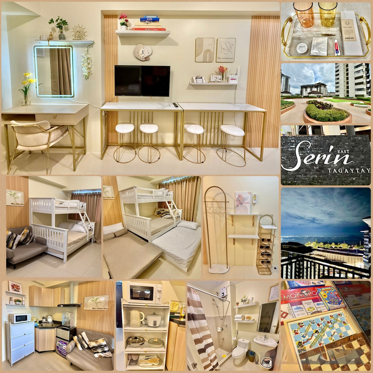 Rilassati nel nostro tranquillo appartamento a Twinlakes Tagaytay, perfetto per il relax o il lavoro. Goditi il wifi veloce, splendide viste sulle montagne e una vista parziale sul lago Taal dal balcone, ideale per sorseggiare caffè o vino. Lo spazio include pentole, utensili e un forno a microonde per una comoda preparazione dei pasti. Forniamo articoli da toeletta e asciugamani per un soggiorno confortevole e senza pensieri. Che tu sia qui per ricaricarti o per dare sfogo alla creatività, questo tranquillo rifugio offre la fuga perfetta.