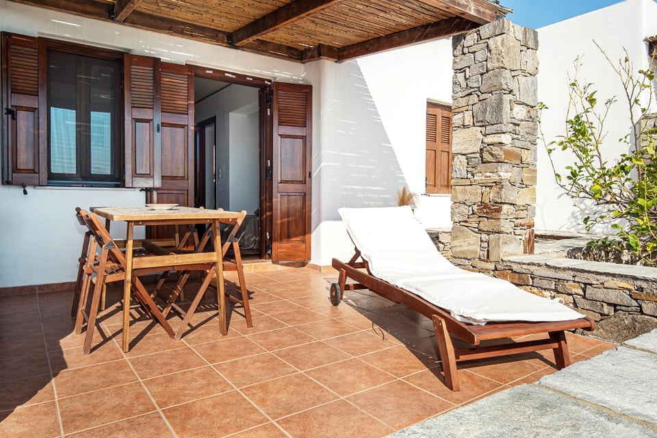 Casa tradizionale isolana sulla spiaggia. Situata in un complesso, sulla tranquilla spiaggia di Karavi, a breve distanza dal porto (13 minuti a piedi). La casa è di 90 m², completamente attrezzata e suddivisa su due livelli. Al piano inferiore si trovano le due camere da letto, il soggiorno e i due bagni. Al livello superiore si trovano la cucina e il soggiorno in un open space. L'area esterna è composta da due terrazze. C'è un parcheggio privato accanto alla casa, riservato ai soli residenti del complesso
