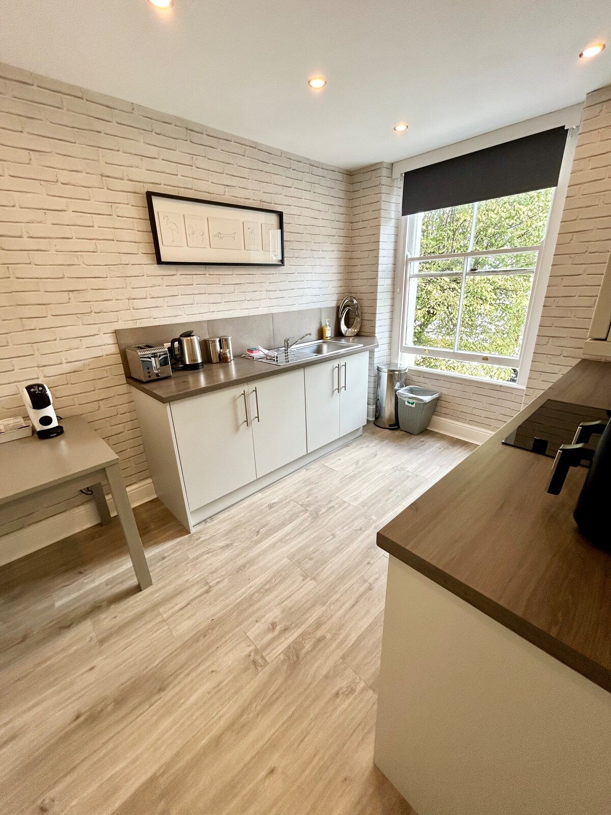 Questo spazioso appartamento al primo piano è ideale per le coppie e dispone di un ampio soggiorno/sala da pranzo, cucina separata di dimensioni standard e camera da letto con bagno interno con doccia. L'appartamento è uno dei cinque appartamenti della nostra casa di famiglia; ne occupiamo due e i restanti due sono affitti a lungo termine con un solo inquilino in ciascuno, e siamo in generale una famiglia tranquilla.