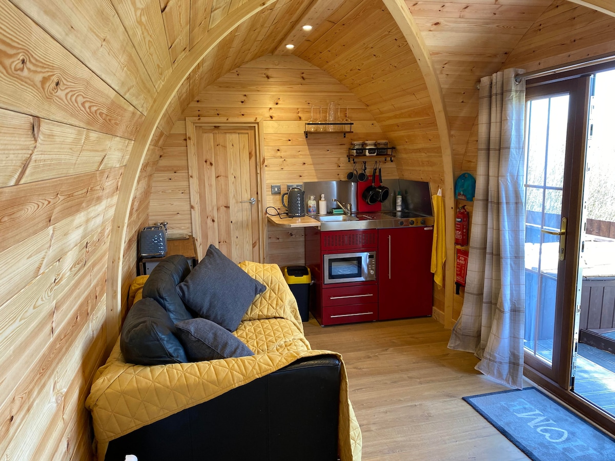 Pod glamping con vasca idromassaggio e vista su Hatterall