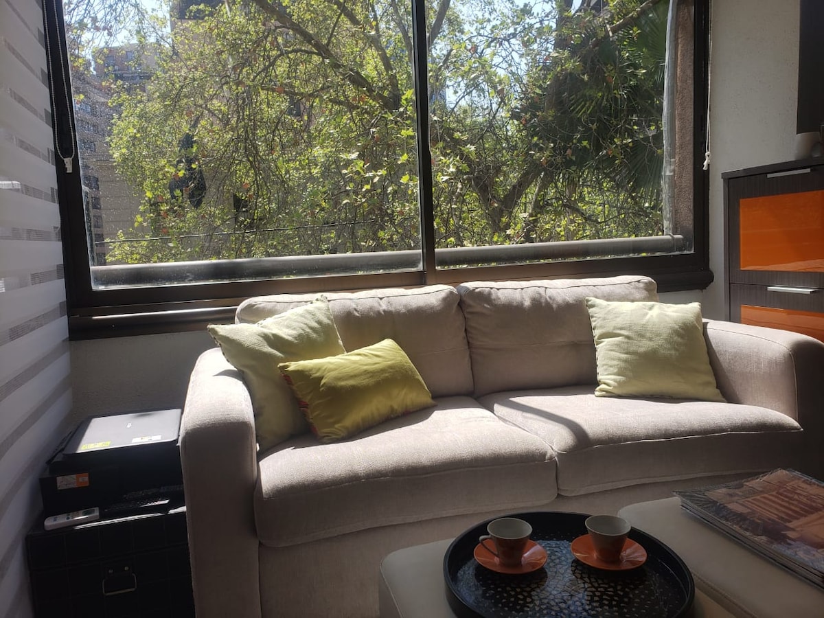 Goditi questo appartamento centrale con 1 camera da letto + divano letto a pochi passi da tutto: strade principali, mezzi di trasporto (autobus e metropolitana), luoghi turistici, quartieri bohémien (Lastarria, Barrio Italia), ospedali, piazze e parchi. Ideale per soggiorni spensierati: avrai tutto il necessario per sentirti a casa. La sua vista a sud lo rende fresco d'estate anche senza aria condizionata e senza rumori esterni! Le finestre termopan consentono di riposare tranquillamente. Aggiungi la colazione se lo desideri!