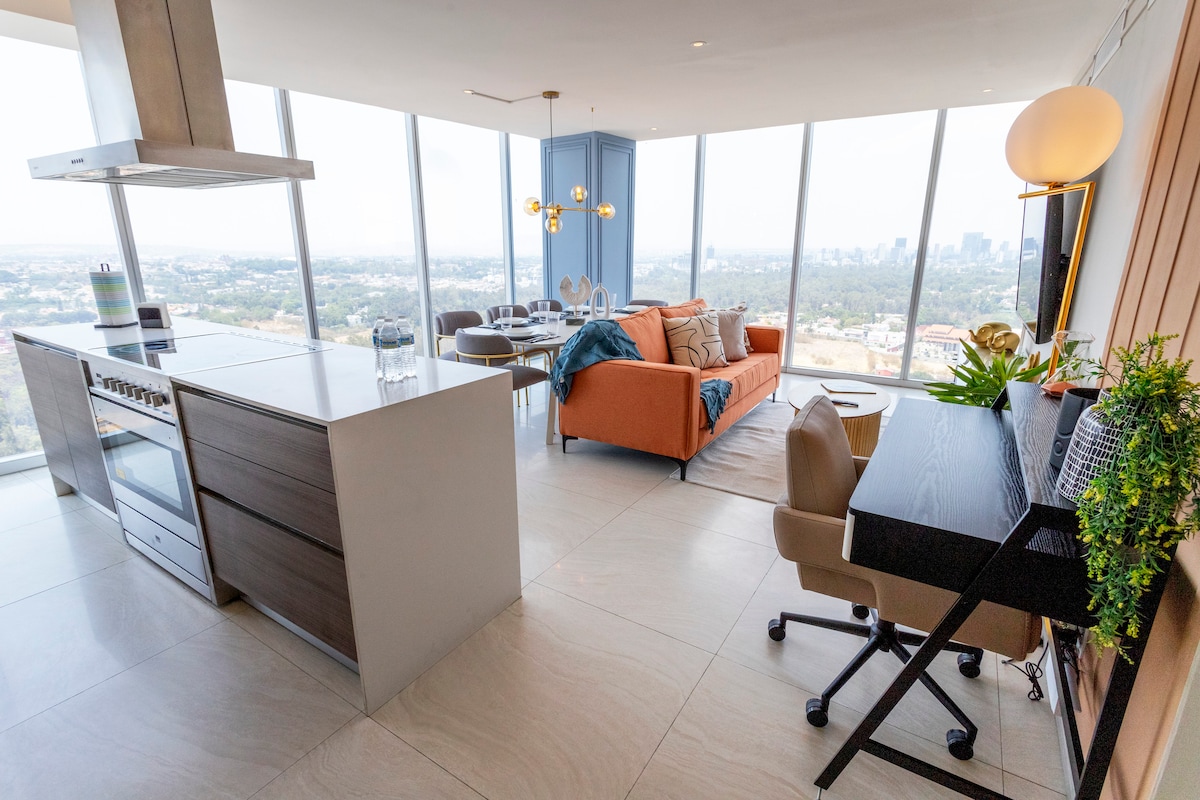 Ti diamo il benvenuto nel nostro appartamento elegante e ben attrezzato al 19 ° piano con vista mozzafiato su Zapopan!!! Con due camere da letto, una con letto king-size e Smart TV, l'altra con letto matrimoniale, entrambe con bagno completo e aria condizionata, avrai un soggiorno confortevole. Il nostro elegante design degli interni crea un'atmosfera accogliente. Situato sopra un piccolo centro commerciale e a pochi passi da Andares, sarai vicino a negozi, ristoranti e divertimenti.