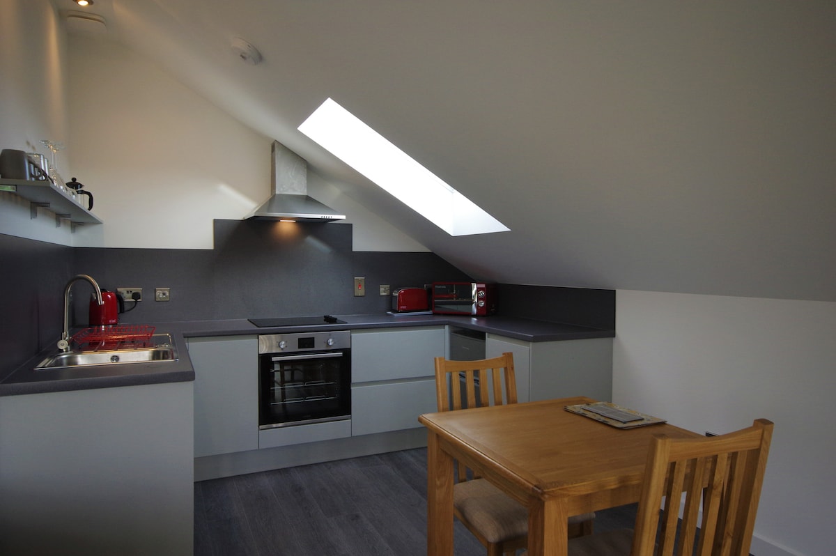 Un moderno appartamento indipendente nel centro del villaggio di Ullapool. Costruito di recente, nel 2020, si trova sopra un doppio garage sul retro della casa del proprietario. Scale e ingresso privati, e una porta a soffietto che si apre dal salotto e dalla cucina open space su un balcone con vetrata. Una camera matrimoniale con bagno interno con doccia. Completamente elettrico. TV a colori, wifi e parcheggio privato condiviso. Molto centrale per tutti i servizi di questo grazioso villaggio di pescatori, che distano pochi minuti a piedi.